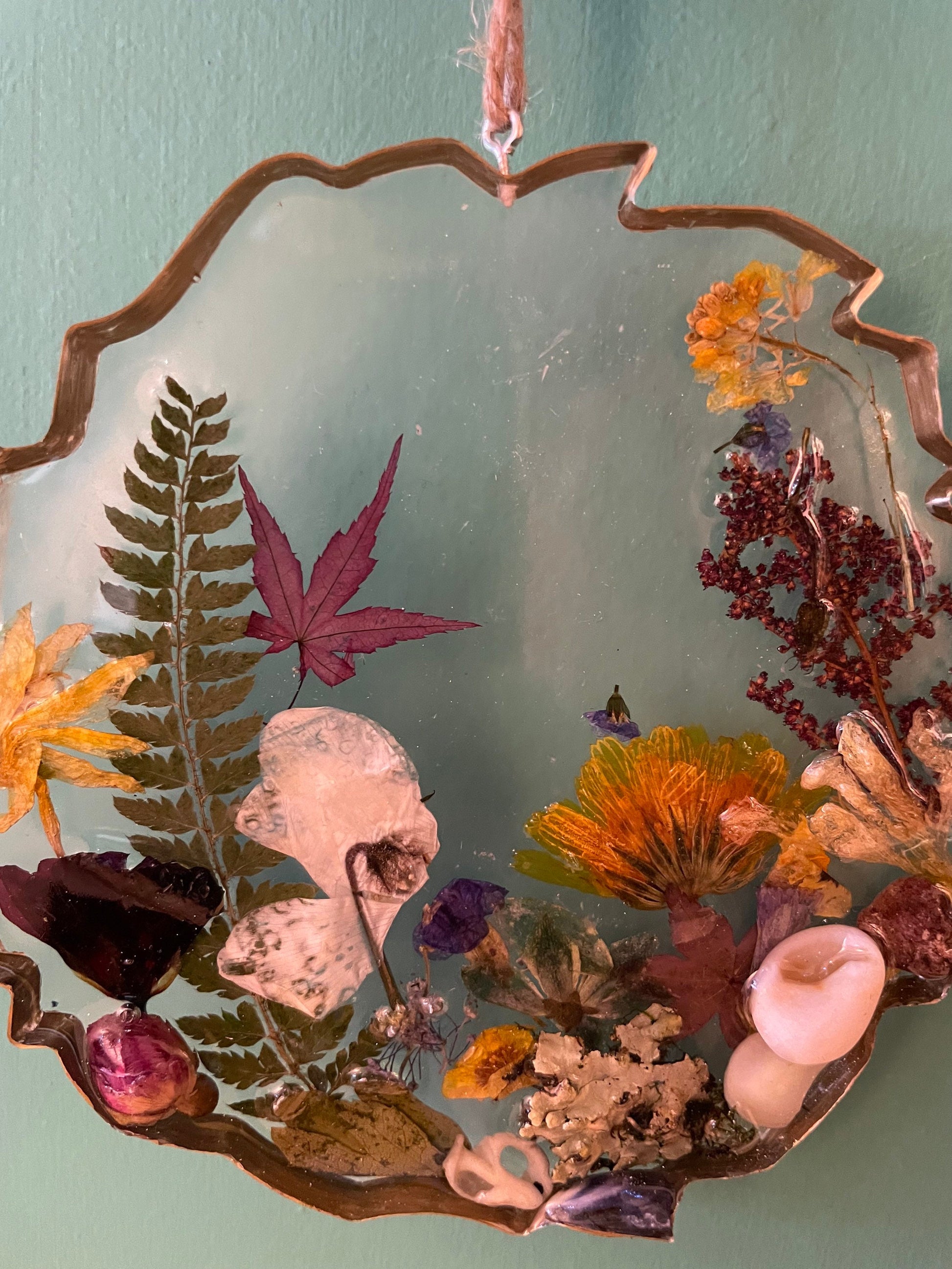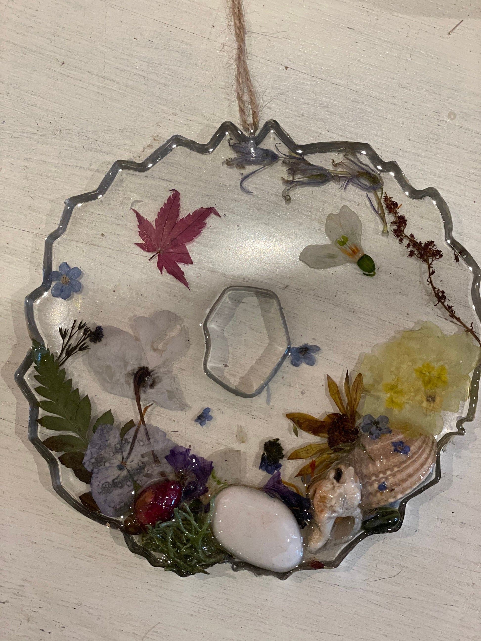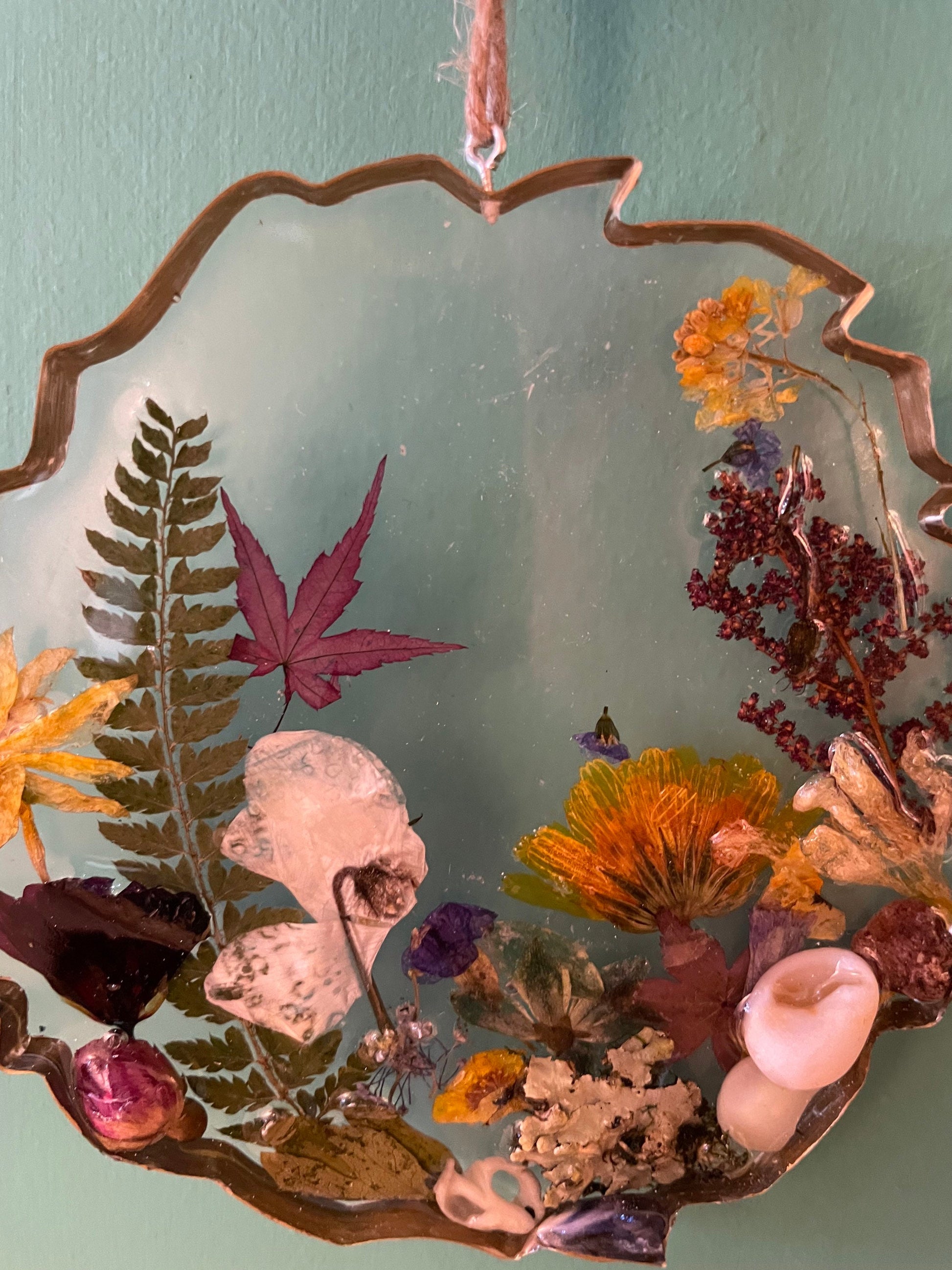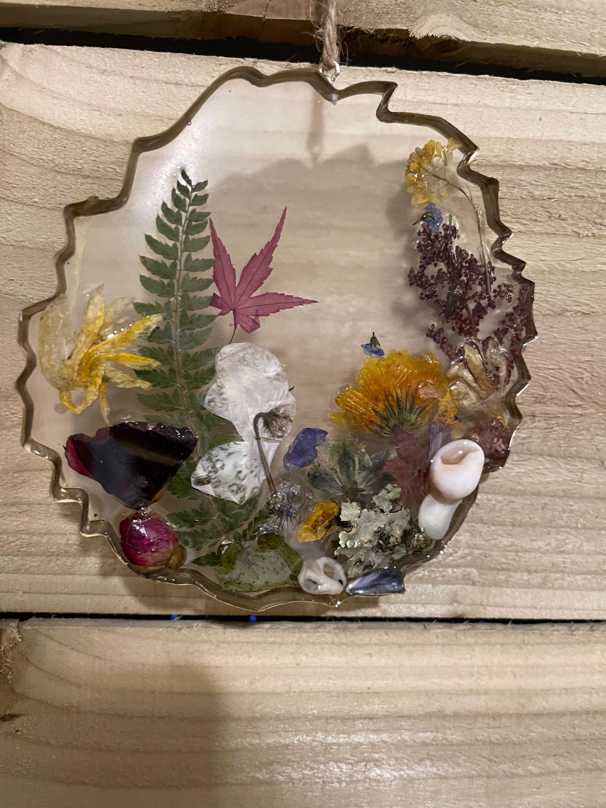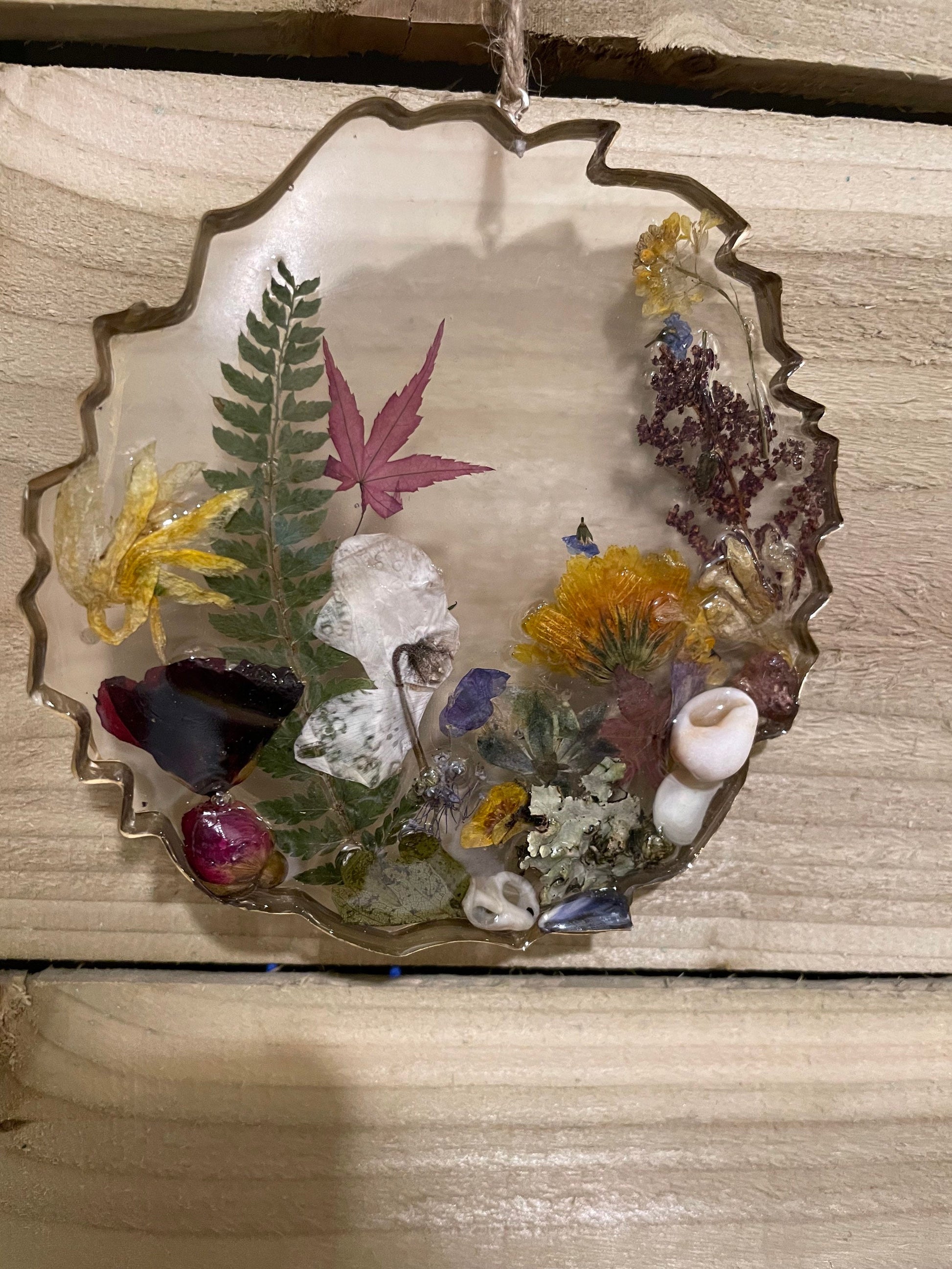 A beautiful woodland scene made from real flowers and leaves , set in resin and hung on cord with pieces of real drift wood to complete the rustic outdoors feel of this item.
