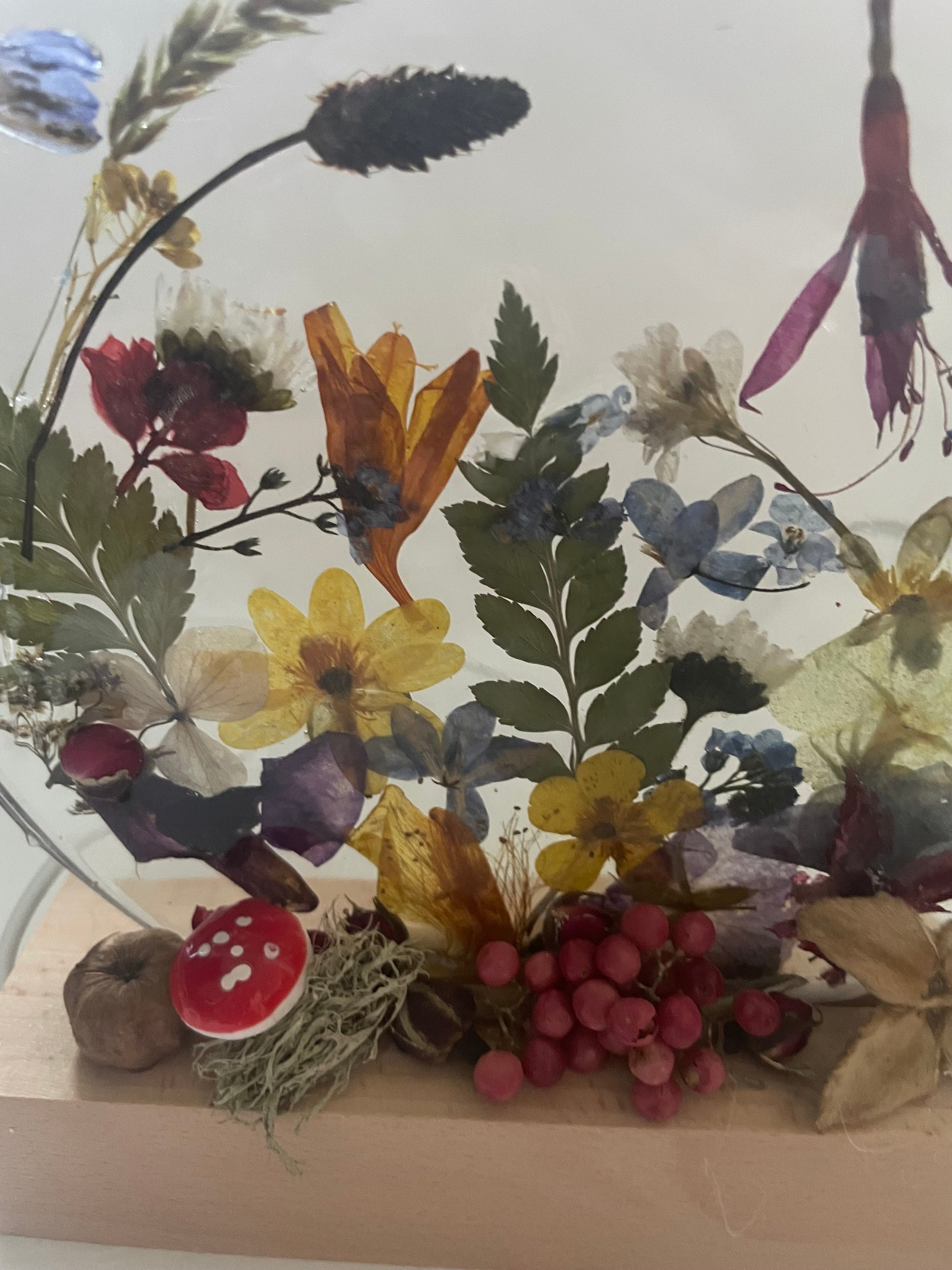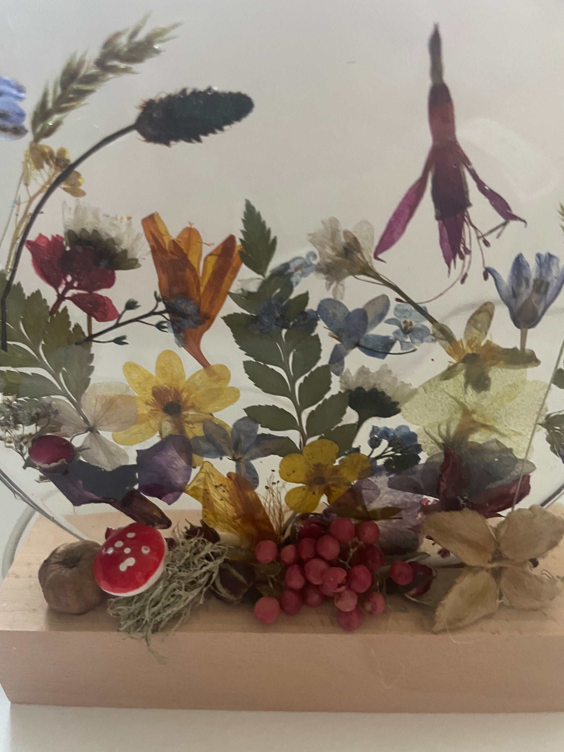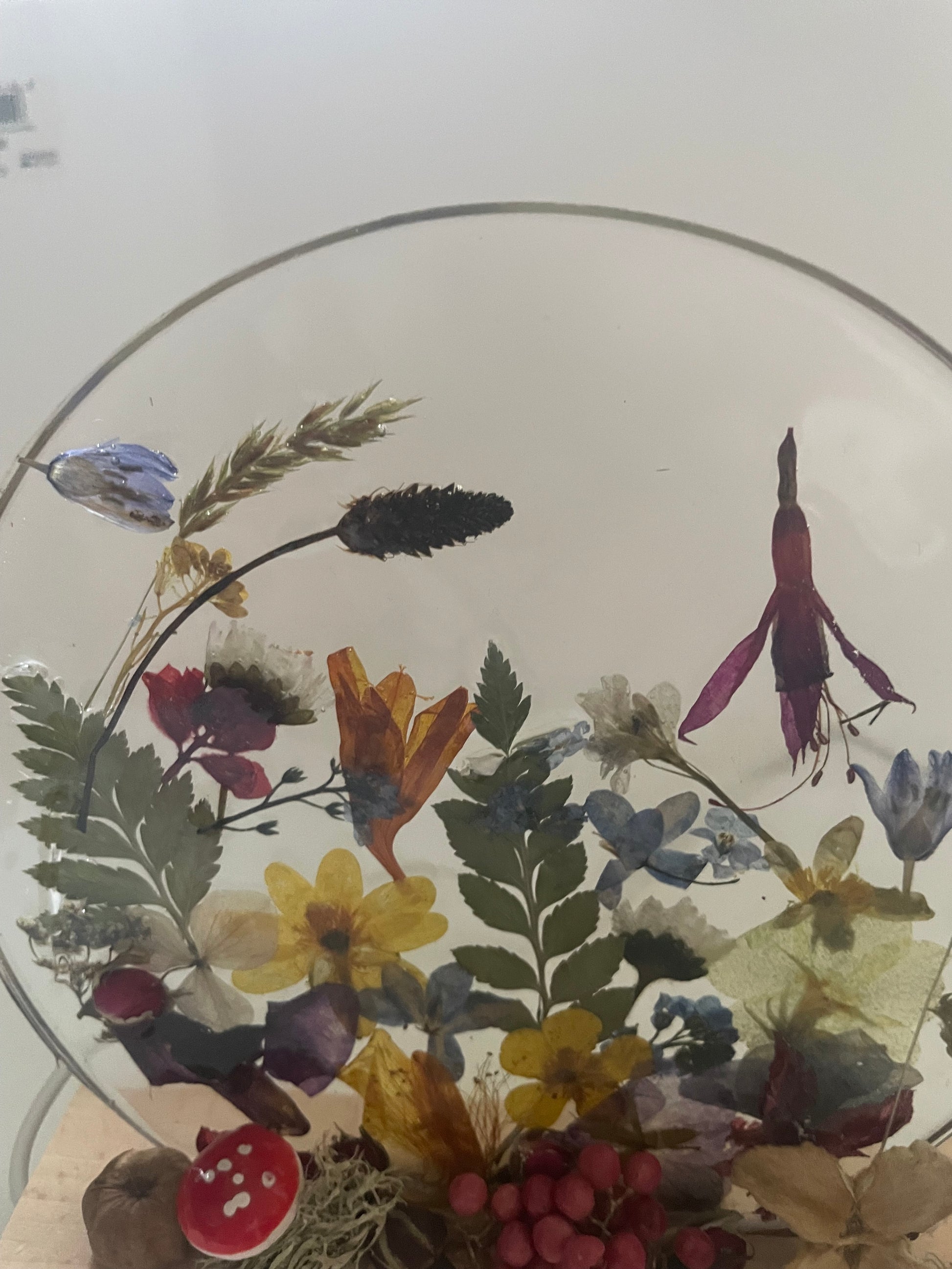 This is beautiful English country garden scene made from real flowers, leaves, shells and twigs, set in resin and displayed on a wooden stand. These are hand made to order so they may vary slightly as each flower and leaf is different !