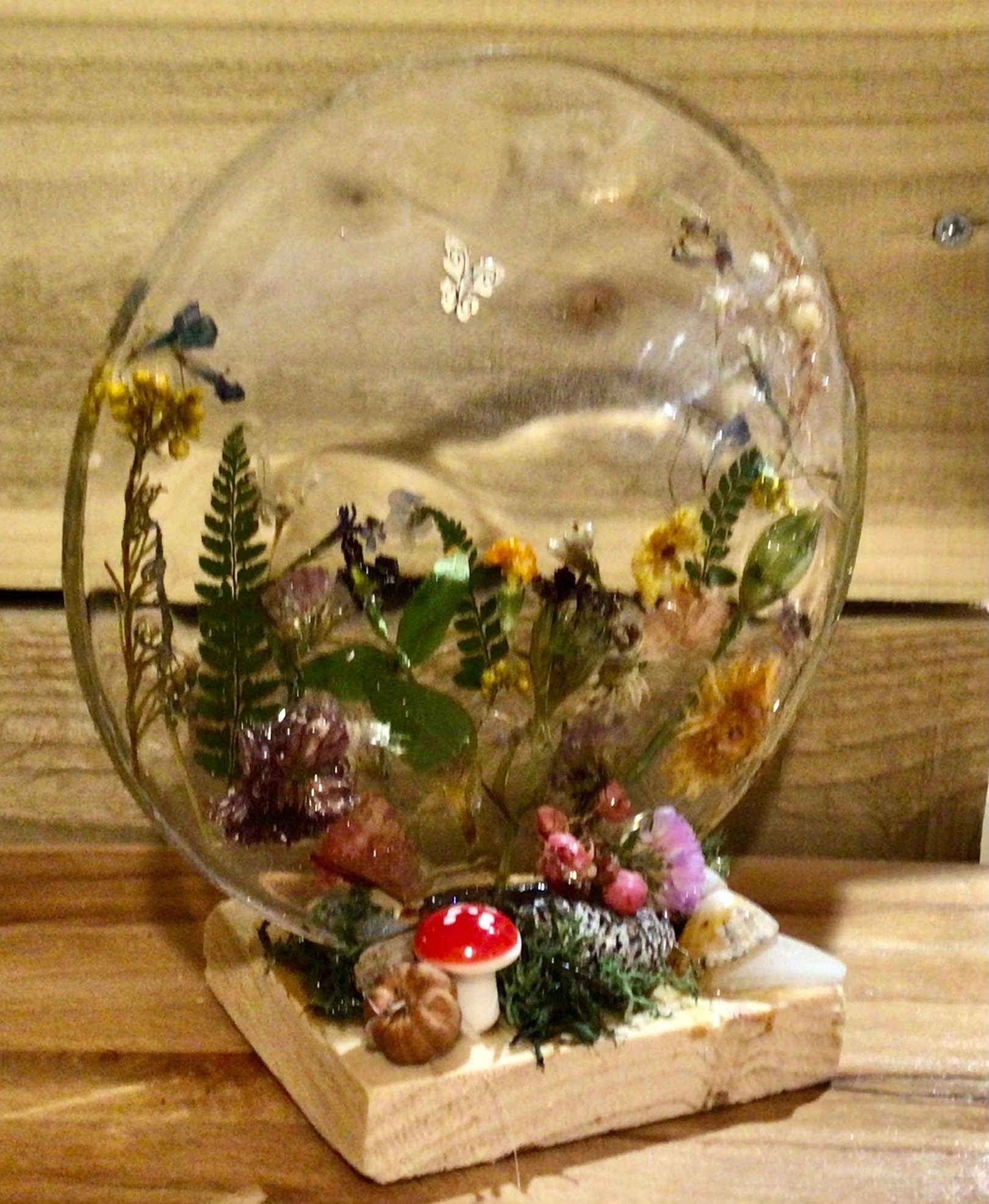 This is beautiful English country garden scene made from real flowers, leaves, shells and twigs, set in resin and displayed on a wooden stand. These are hand made to order so they may vary slightly as each flower and leaf is different !