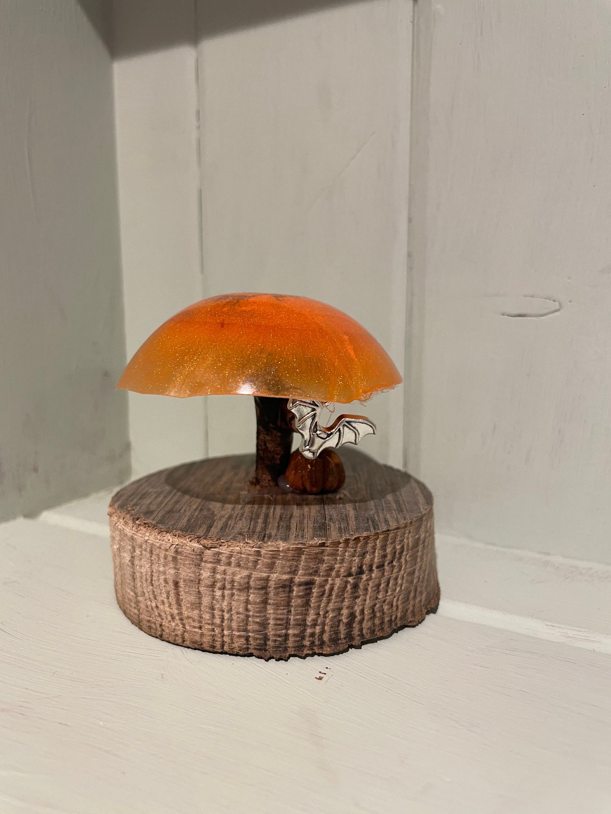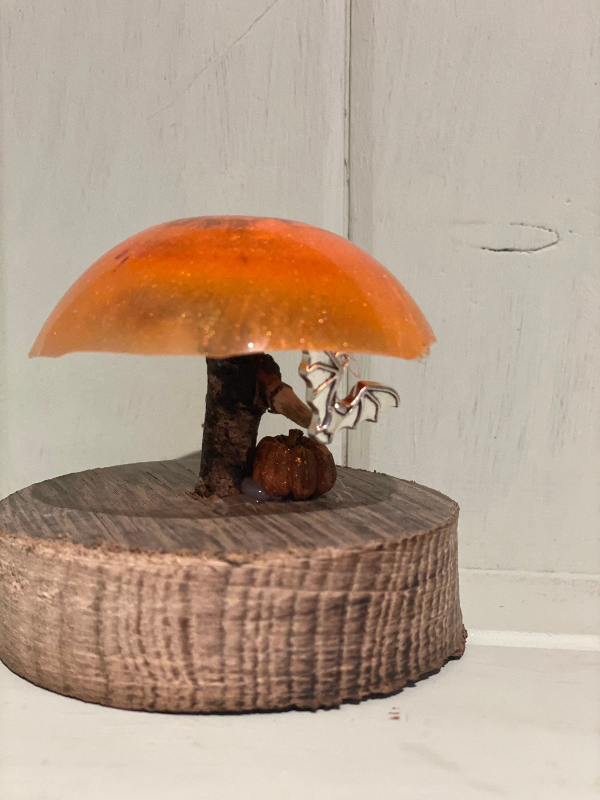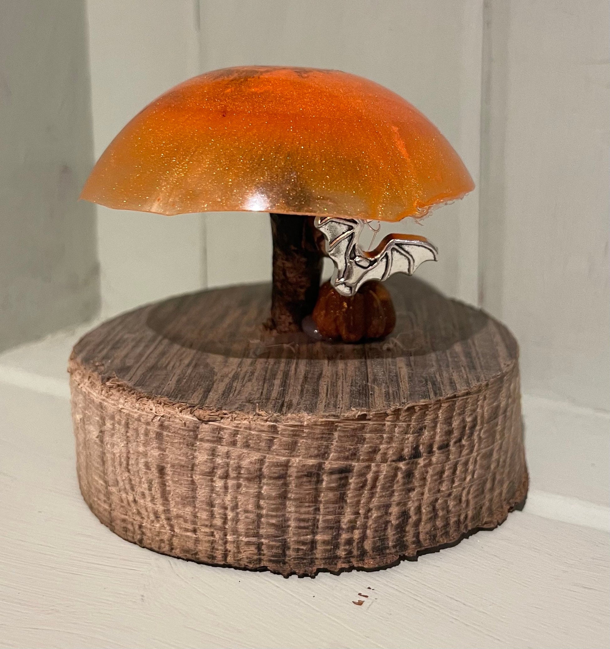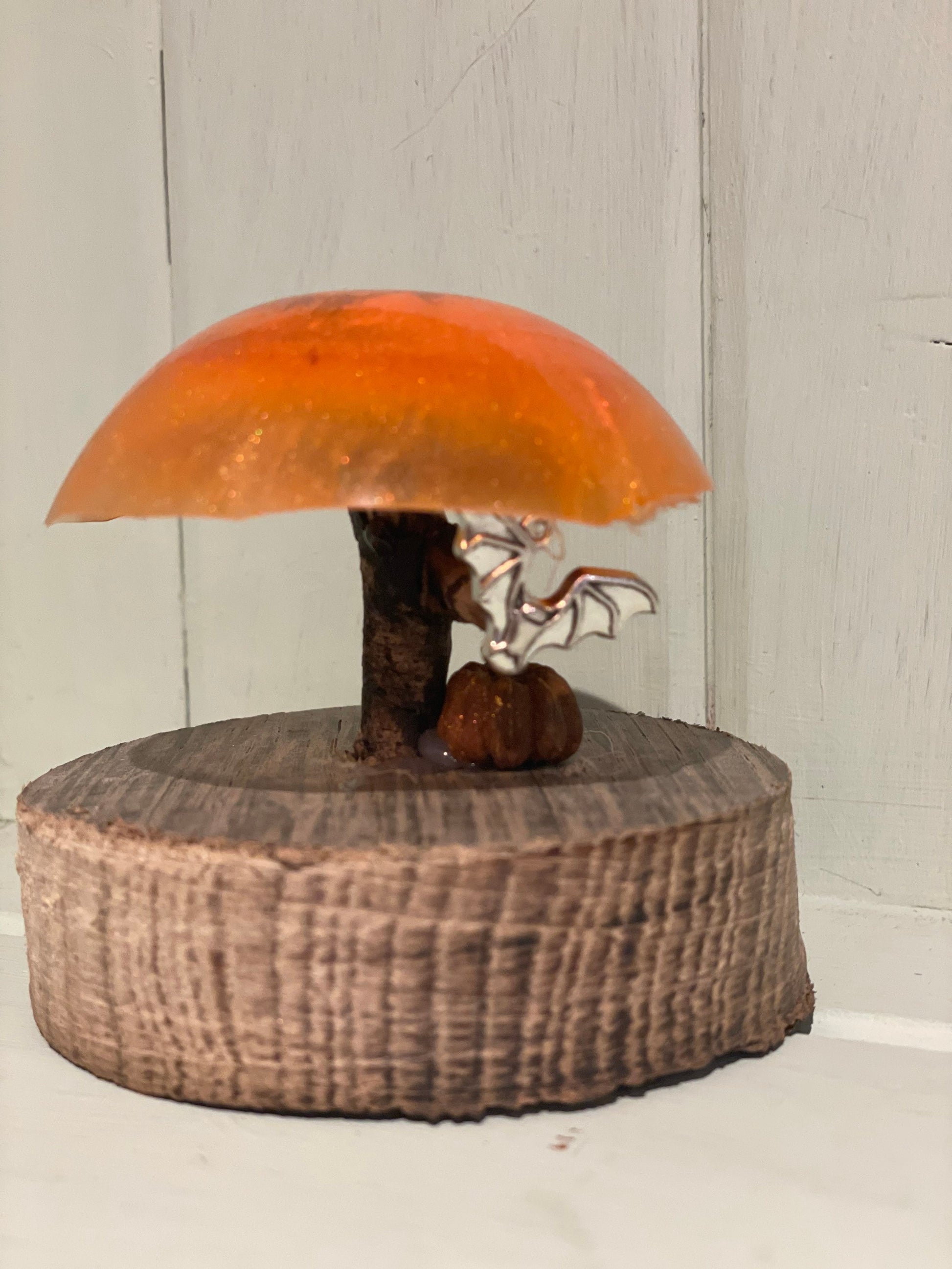 The toadstool is made from resin with shimmering mica glitter in shades of bright orange with a driftwood stem. A silver bat charm hangs from invisible thread and a miniature pumpkin( seed pod and reclaimed wood base complete the look.