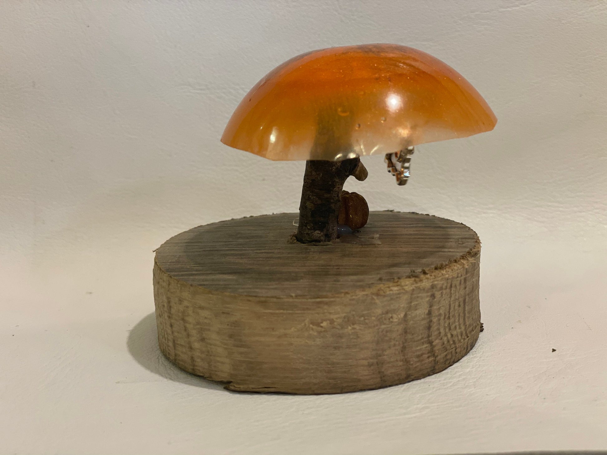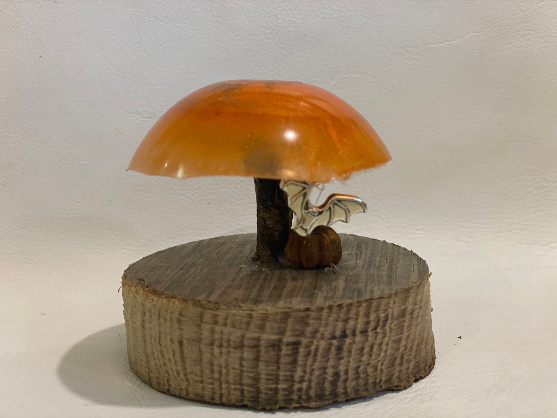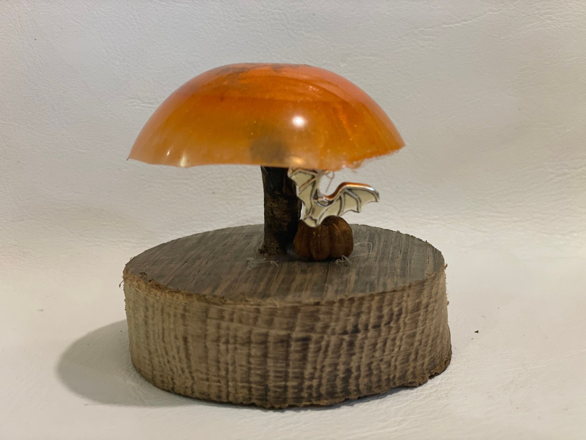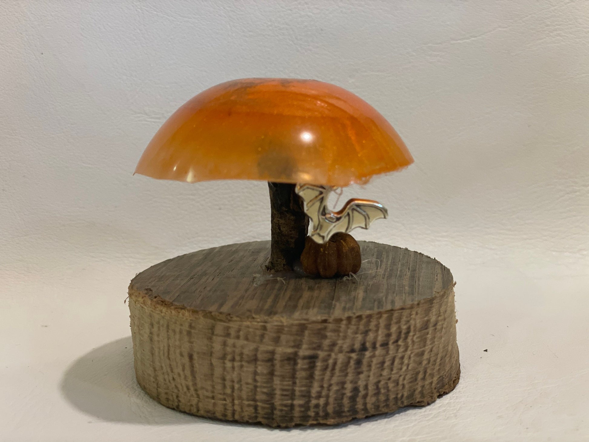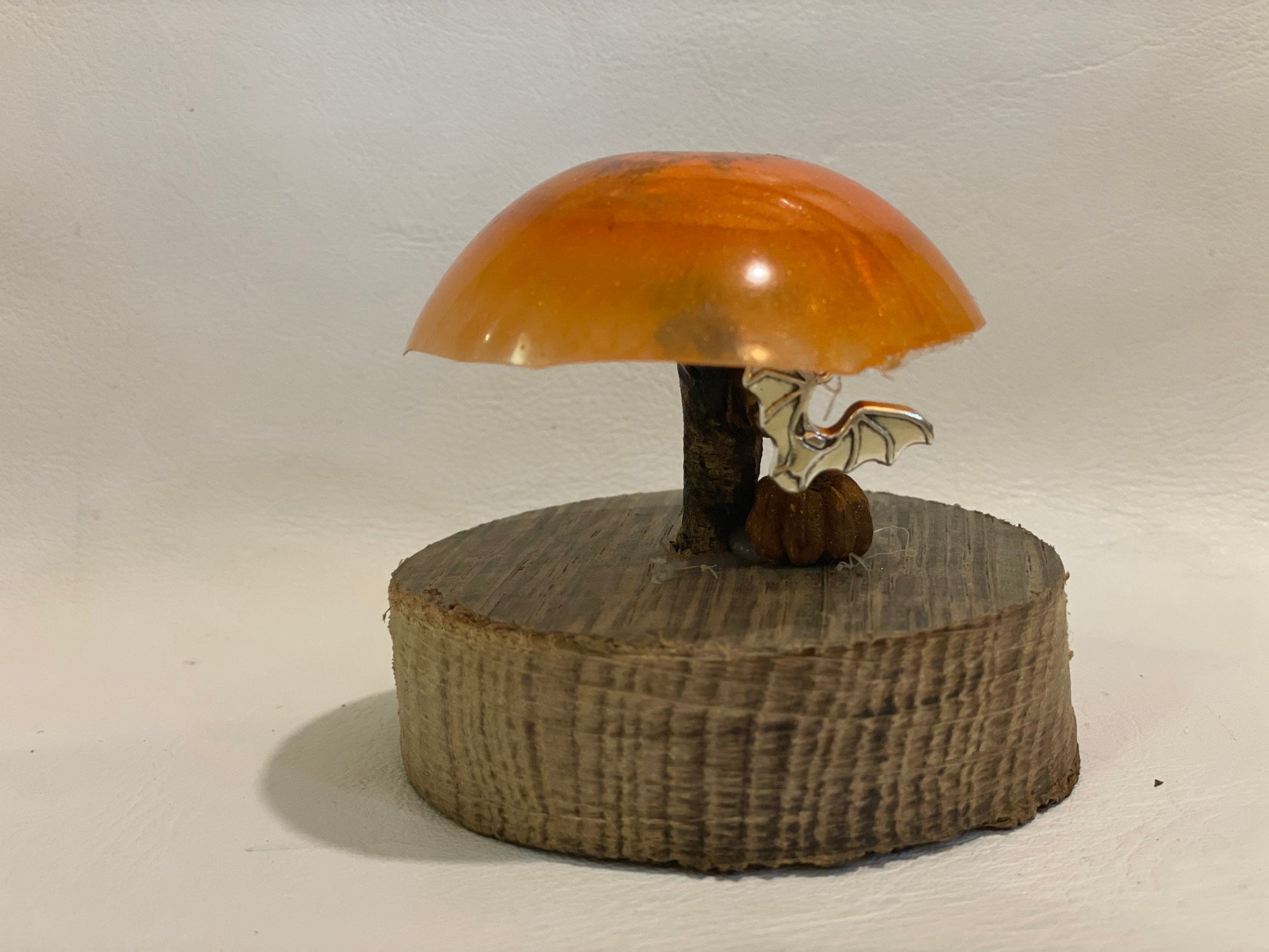 The toadstool is made from resin with shimmering mica glitter in shades of bright orange with a driftwood stem. A silver bat charm hangs from invisible thread and a miniature pumpkin( seed pod and reclaimed wood base complete the look.